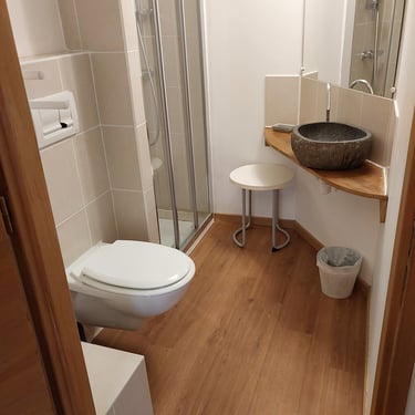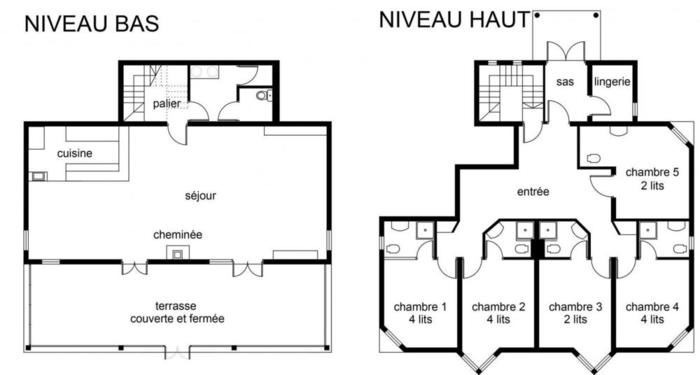 A l'étage, 5 chambres ont été aménagées avec, pour chacune d'elles, une salle d'eau-wc privative. Chacune des chambres possède un lit double, et 3 d’entre elles ont également une mezzanine avec 2 lits simples. Tous les lits peuvent êtres séparés en lits simples.