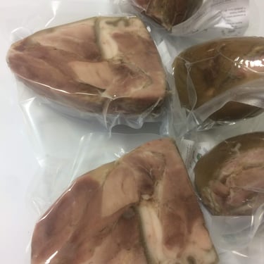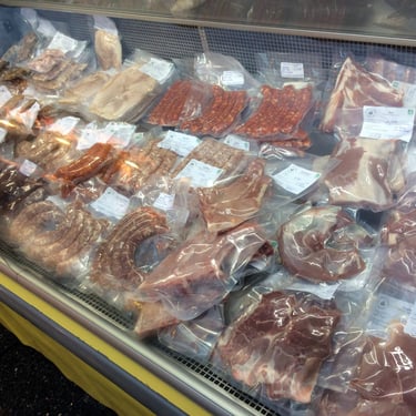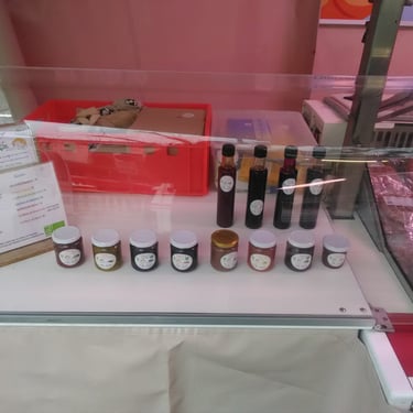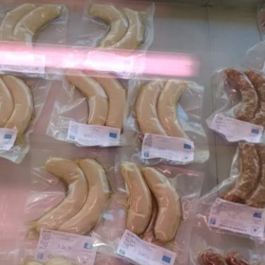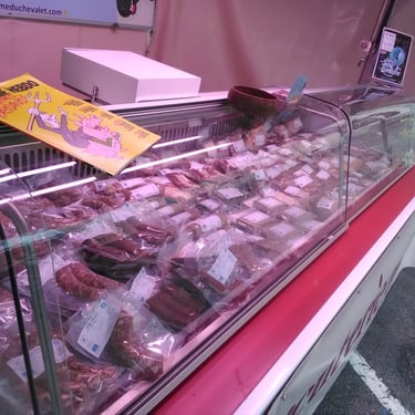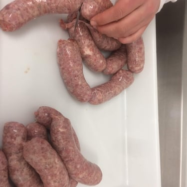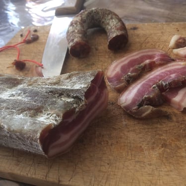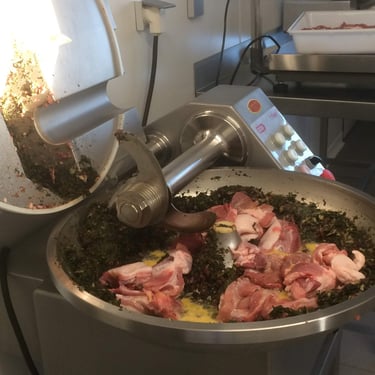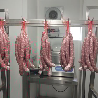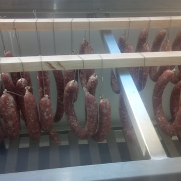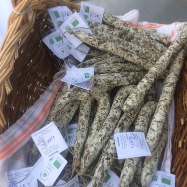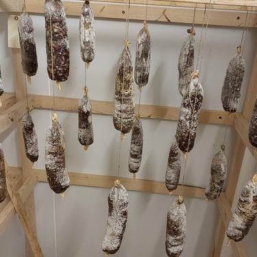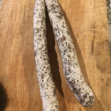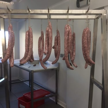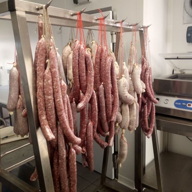 Nous avons fait le choix de n’utiliser aucun adjuvant chimique ni conservateur autre que du sel de mer. Nous faisons nous même nos mélanges d'épices et ne travaillons avec aucun mélange industriel prêt fait. Alors nos charcuteries ne sont pas très roses, nos saucissons ne sont pas tous blancs et uniformes, nos saucisses n'ont pas le même gout que toutes les autres, mais on s’en porte tous mieux.
